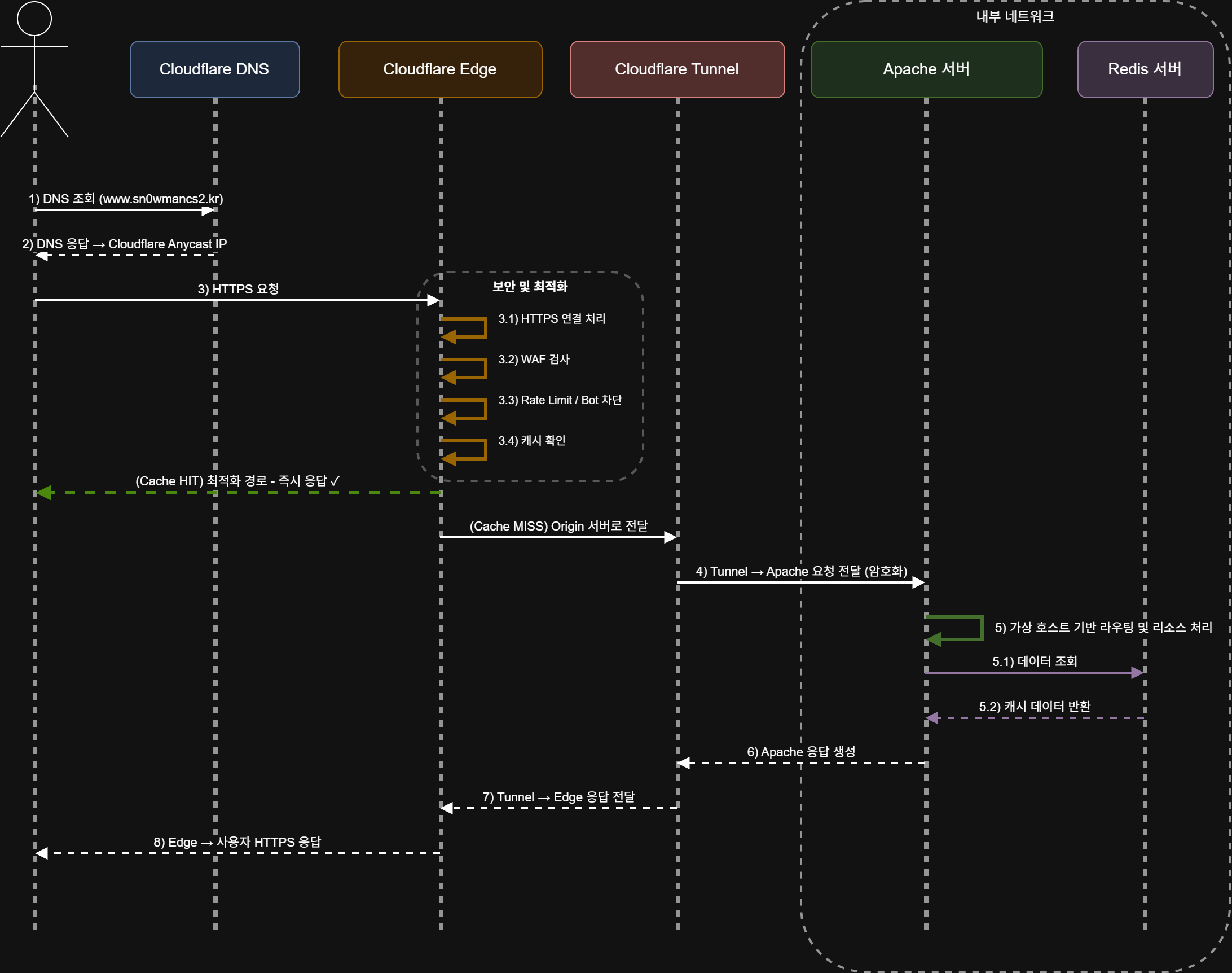 - Cloudflare Edge에서 보안과 캐시를 먼저 처리하고